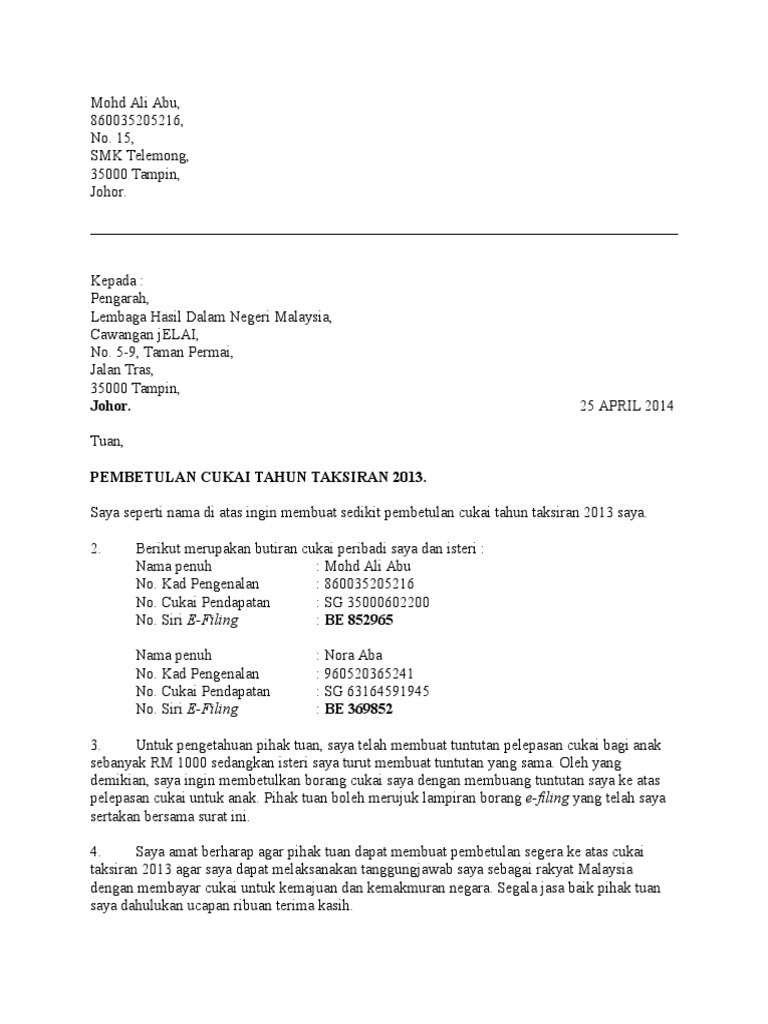 Contoh Surat Rasmi Pembetulan Lhdn Amal 2 Dekad